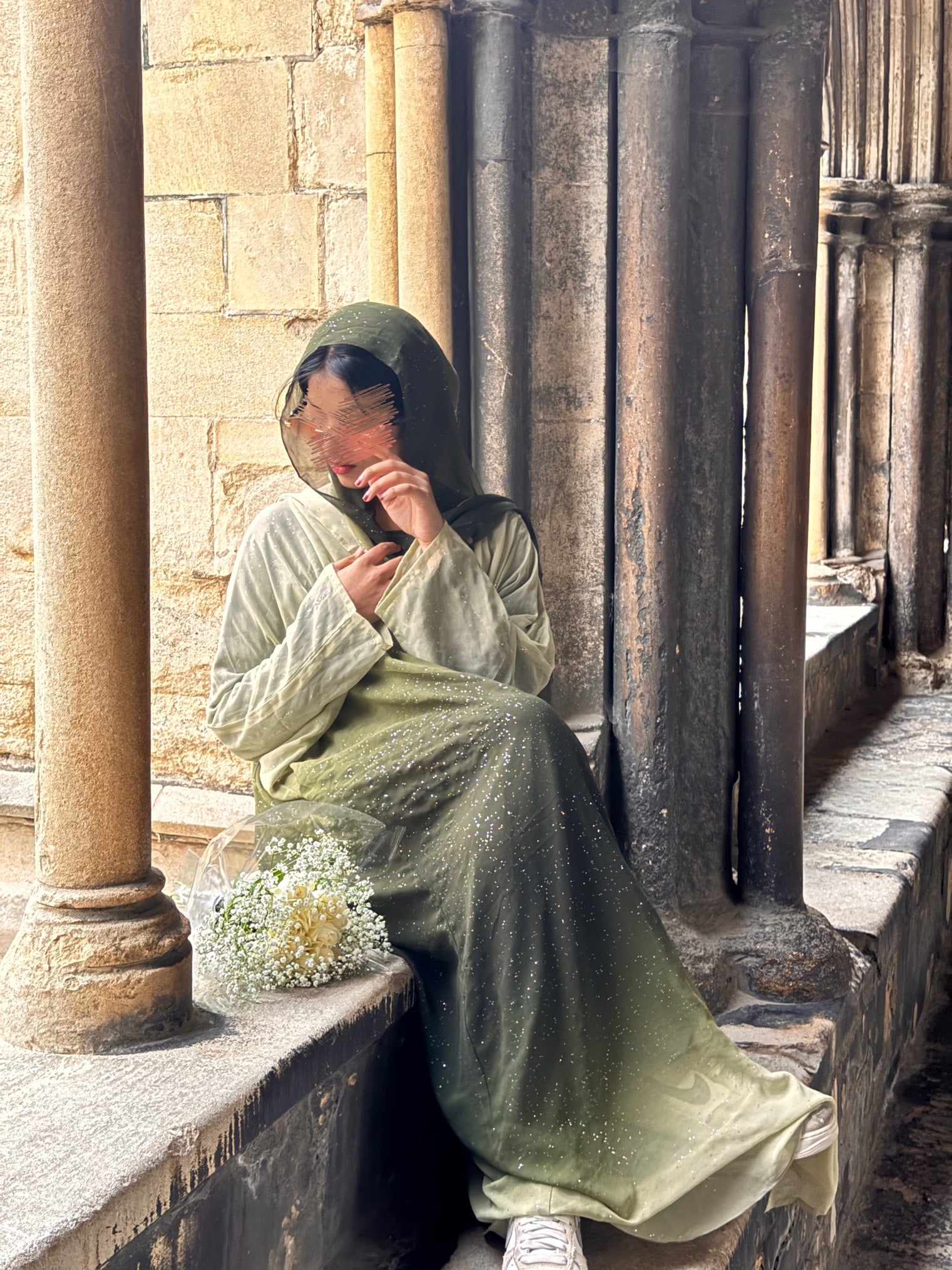 A graceful blend of modern elegance ind timeless charm, this abaya is tailored in kaftan cut from premium dual-shade chiffon fabric adorned with delicate glitter details that shimmer beautifully with every step along with hijab. The soft gradient tones create a sophisticated ombré effect, making it perfect for both daytime gatherings and evening occasions.